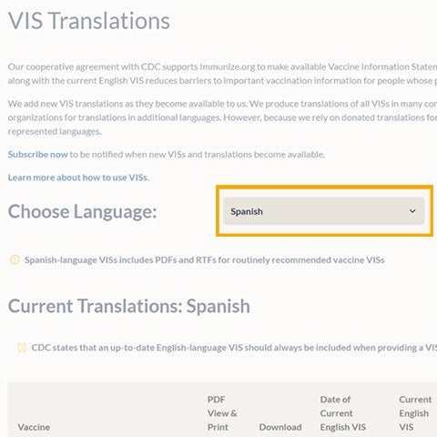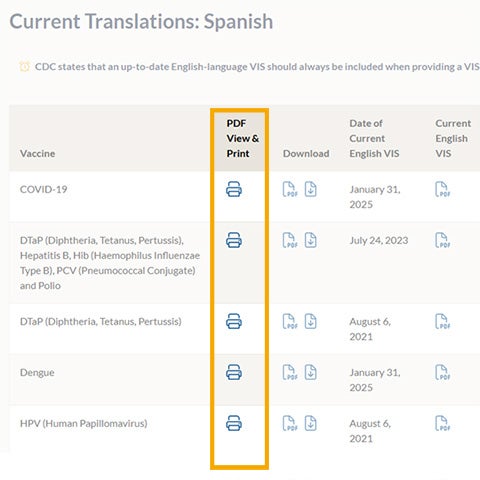 Click on the Translated VIS link (on mobile devices) or PDF View & Print icon for a specific vaccine to open the translated VIS PDF.