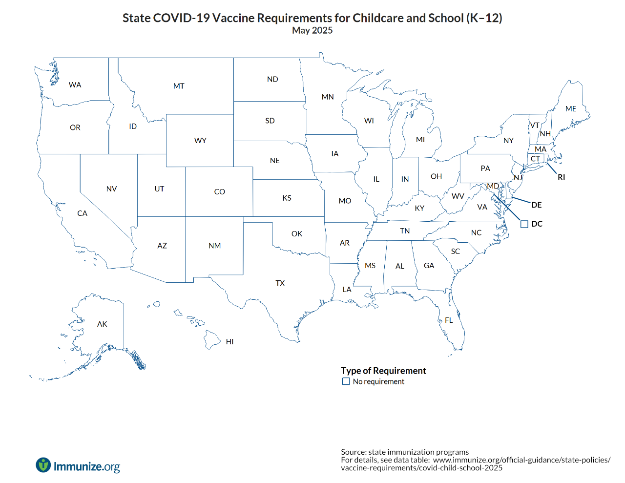 NOTE: As of May 2025, no state required COVID-19 vaccine for any grade level.