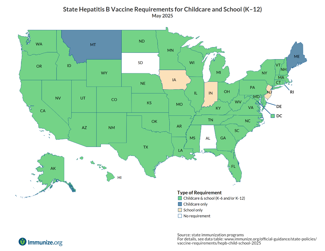 | Hepatitis B Vaccine Requirements for Childcare and School (K–12) as of May 2025 |
