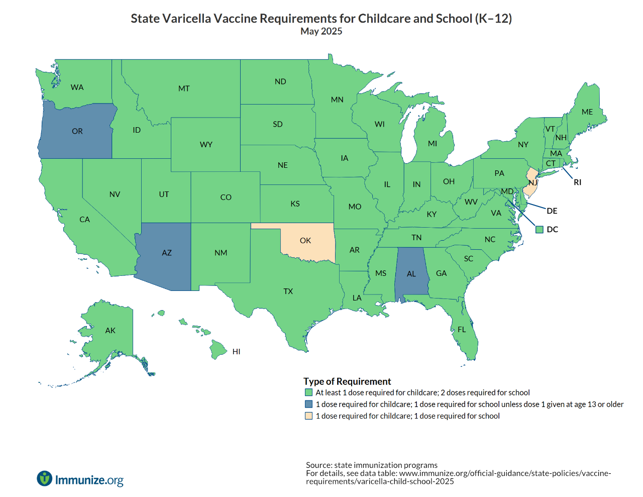 | Varicella Vaccine Requirements for Childcare and School (K–12) as of May 2025 |